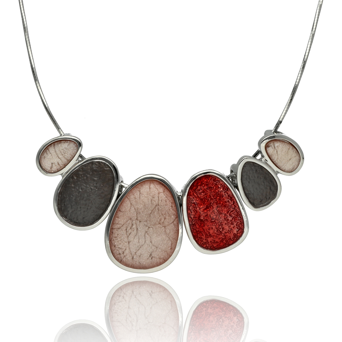 Náhrdelník je vyroben z hypoalergenního kovu, zdobený barevným smaltem a pryskyřicí pro hloubkový efekt.
