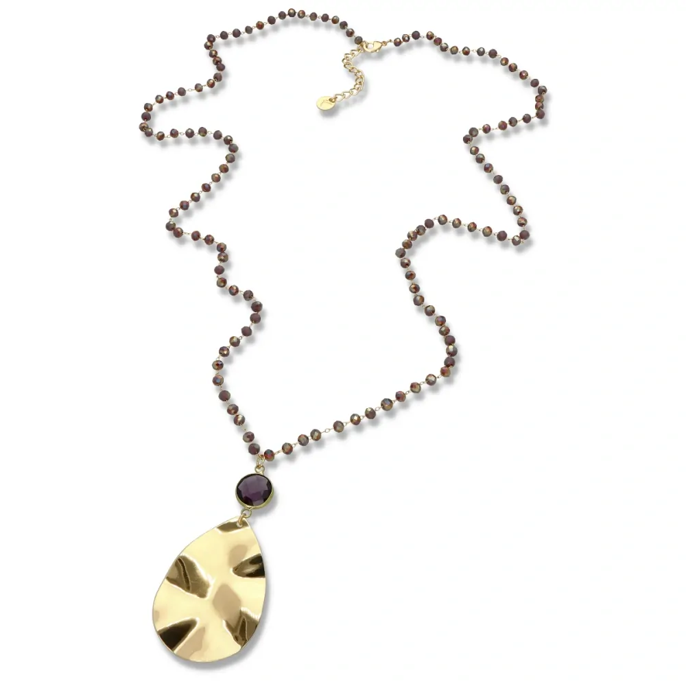 Jemný, dlouhý formální náhrdelník vyrobený z antialergického kovu (mosaz), krystalů a broušeného skla.
