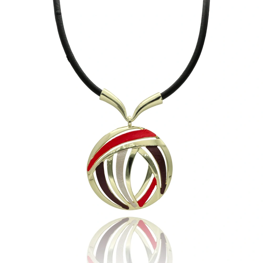 Poutavý náhrdelník vyrobený z antialergického kovu, přírodní kůže a barevného smaltu.