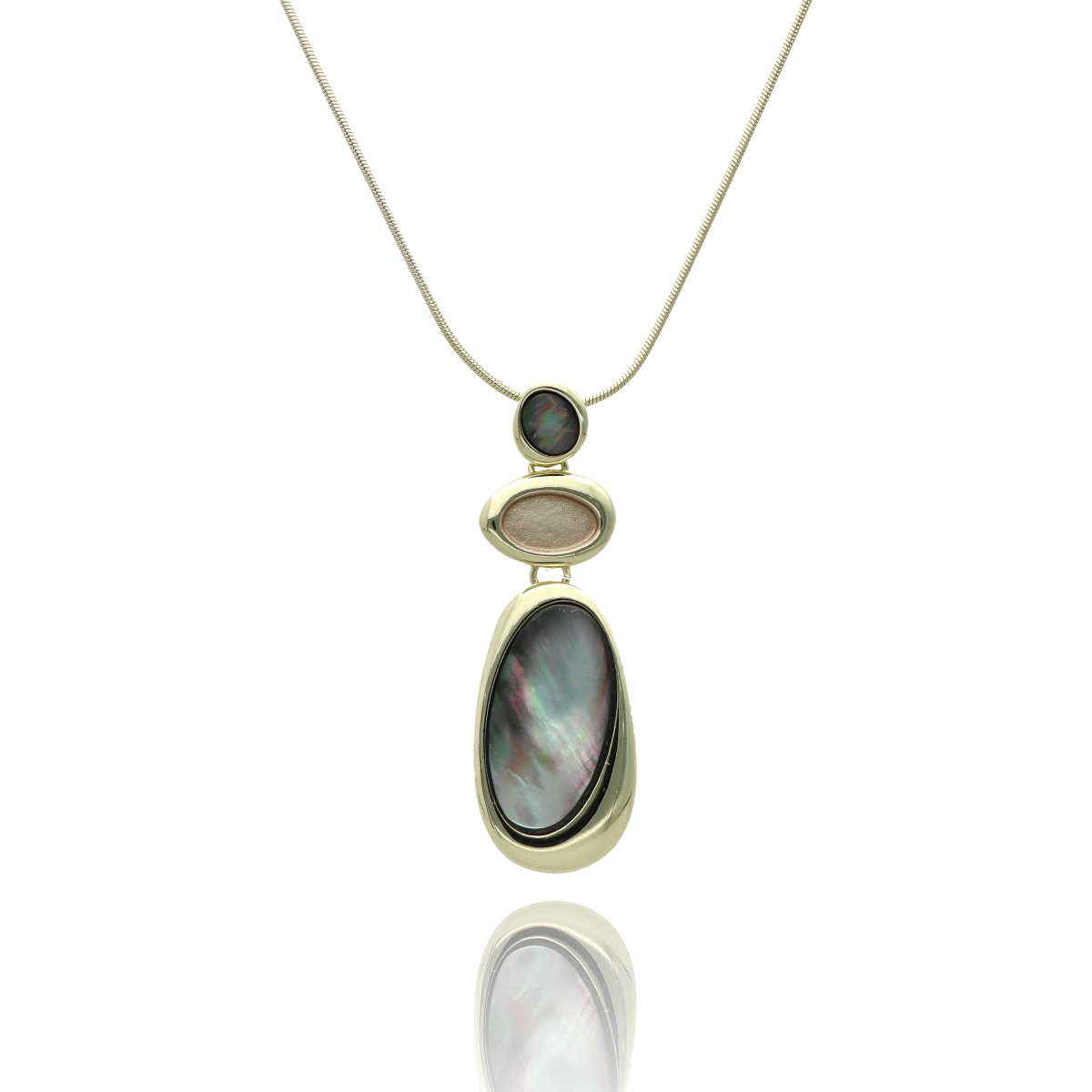 Náhrdelník z antialergenního kovu, barevný smalt a šedá mušle.