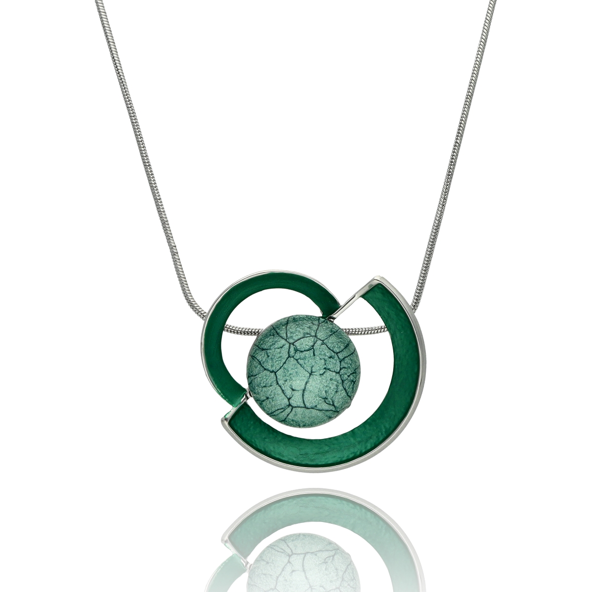 Ústředním bodem náhrdelníku je ručně vyrobený pryskyřičný prvek, do kterého byla zasazena mimořádná hra barev a odlesků, která dodává kompozici hloubkový efekt.