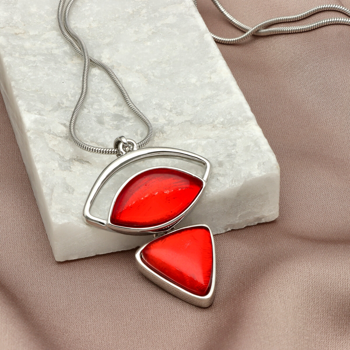 Dlouhý, zeštíhlující náhrdelník vyrobený z hypoalergenního kovu a barevné pryskyřice.