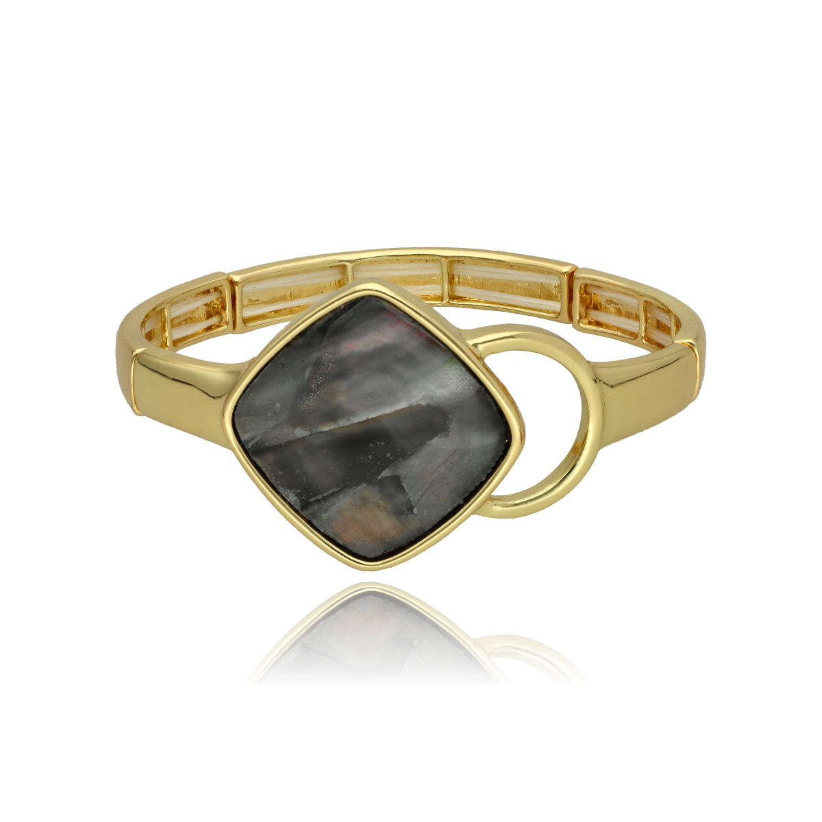 Stylový náramek na gumičce, vyrobený z antialergenních kovových prvků a přírodní šedé mušle.