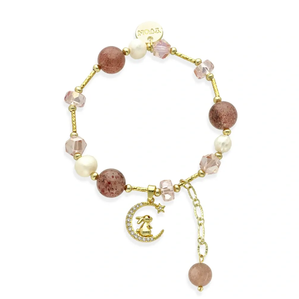 Šperk z pozlacené mosazi, přírodních perel, křišťálu a přírodních kamenů (jahodový křemen).