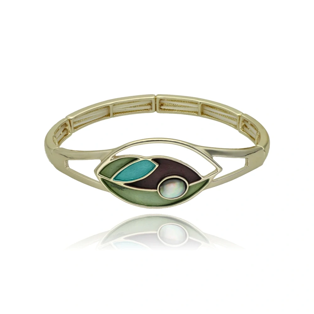 Elegantní náramek z antialergického kovu, barevného smaltu a přírodní mušle.