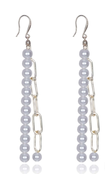 Extrémně dlouhé (12 cm) náušnice zeštíhlující krk, vyrobené z antialergického kovu a jemných perel. Perfektní doplněk k večernímu stylingu.