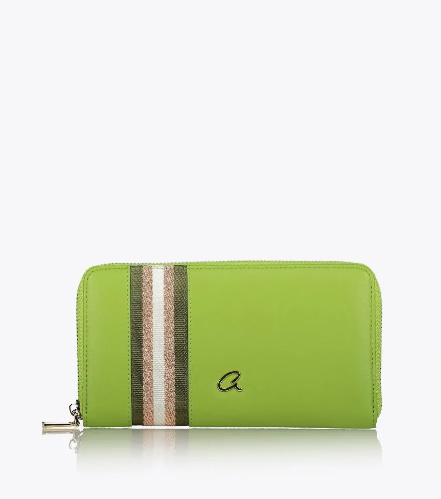 Dámská peněženka na zip s lurexovým proužkem, vyrobená z umělé kůže. Má vnitřní kapsy na bankovky, mince a karty. Elegantní peněženka pro bezpečné a stylové nošení peněz a karet.