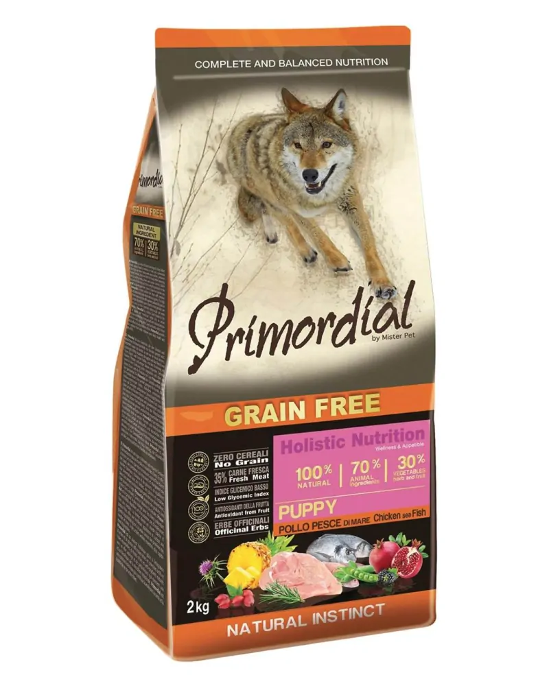 Primordial kuře a mořská ryba pro štěňata je kompletní bezobilné krmivo bohaté na proteiny vysoké biologické hodnoty a obsahuje vhodnou kompozici aminokyselin. Kuřecí maso, striktně z volného výběhu, poskytuje jednoduše stravitelné bílkoviny a atraktivní chuť, kterou psi milují. Mořské ryby bohaté na minerální soli poskytují snadno stravitelné bílkoviny a, jako všechny ryby, jsou bohaté na omega 3 mastné kyseliny, které vykonávají důležitou kosmetickou funkci pro kůži a srst a jsou velmi prospěšné pro kardiovaskulární systém (srdce a cévy). Ovoce a zelenina bohaté na vitaminy, minerály a fytonutrienty, trávicí vlastnosti ananasu, antioxidační funkce granátového jablka a šípku a podpora jater ze strany ostropestřce dodávají tomuto krmivu dokonalou rovnováhu chuti a živin. Jedná se o skutečně holistický produkt, který aktivně přispívá k celkovému zdraví psa.