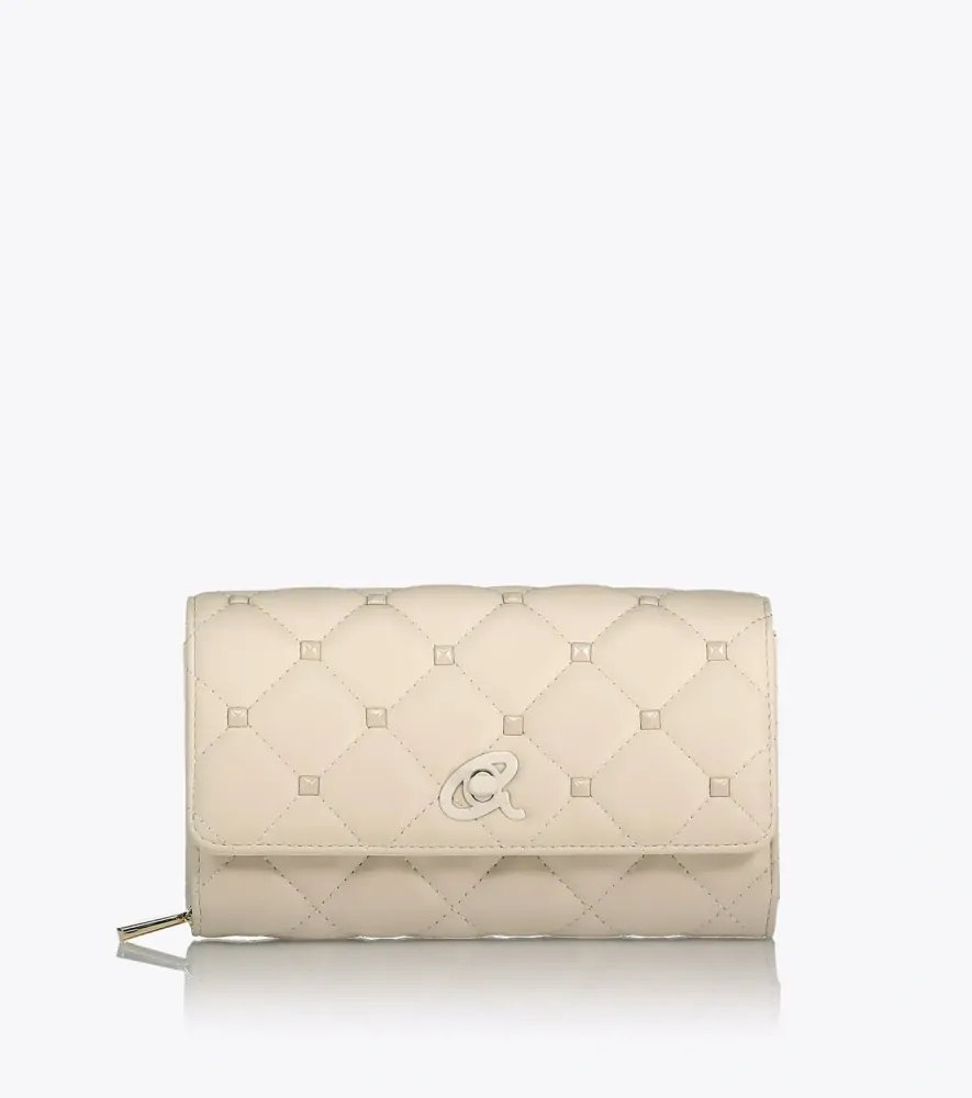 Dámská prošívaná peněženka s cvočky. Má vnitřní kapsy na bankovky, mince a karty. Peněženky jsou absolutní nutností pro každou ženu, která chce nosit své peníze a karty bezpečně a stylově.