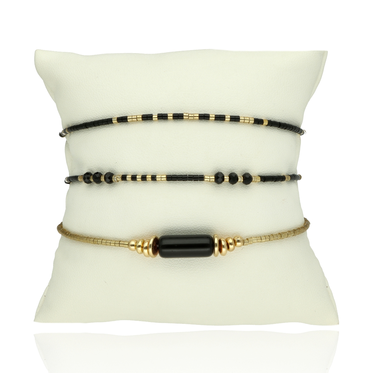Tato sada tří náramků s PŘÍRODNÍMI KAMENY (černý achát) a korálky MIYUKI kombinuje klasickou eleganci s nejvyšší kvalitou řemeslného zpracování.