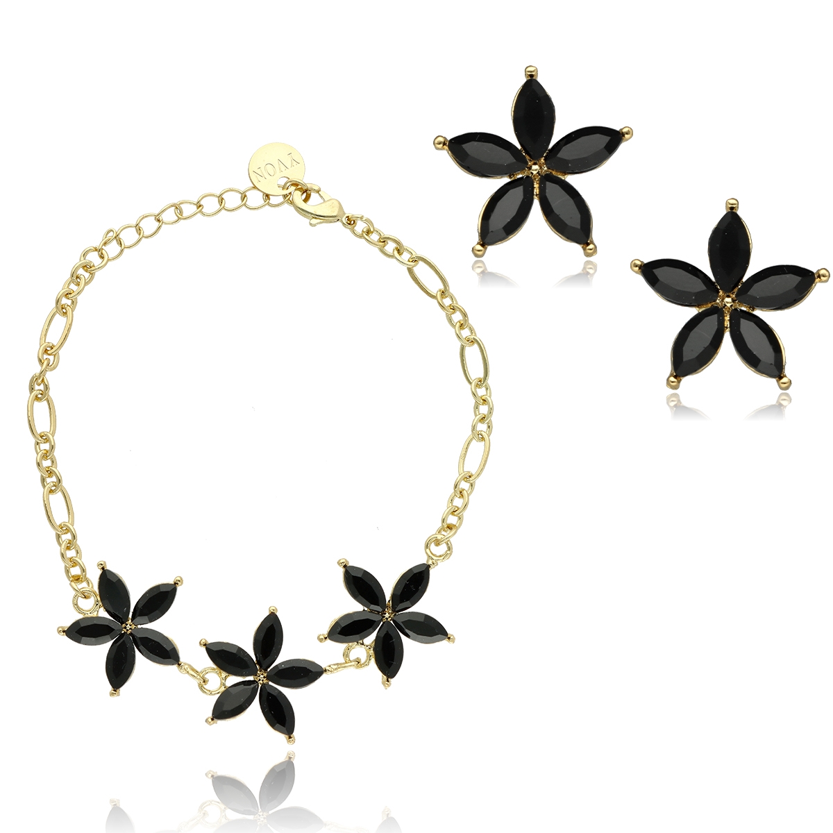 Sada se skládá z nastavitelného náramku a výrazných, přibližně 2 cm dlouhých náušnic.